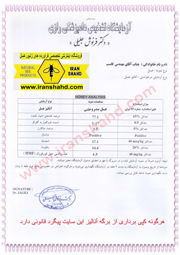 درصد ساکارز: 5.5 %( ساکارز بالای عسل کنار مربوط به شهد طبیعی این گیاه میباشد.)