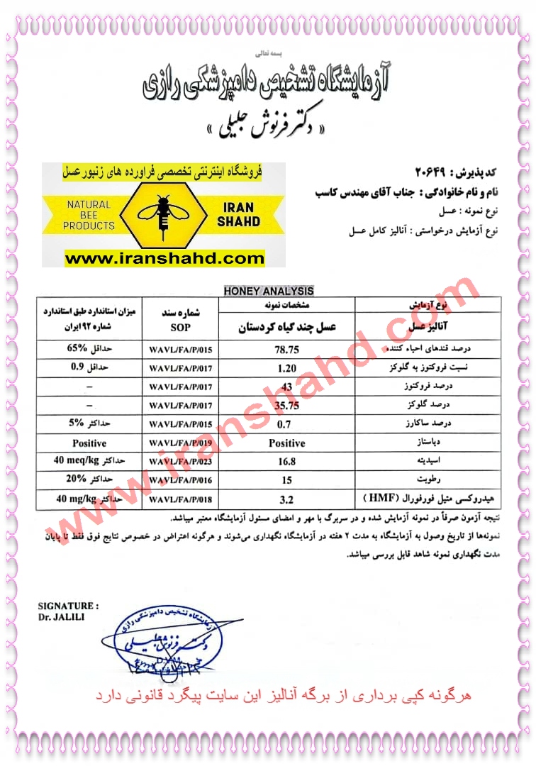 توضیحات: منطقه اورامانات واقع در ارتفاعات مرزی استان کردستان و کرمانشاه دارای پوشش غنی از گیاهان دارویی منحصر به فرد میباشد.برداشت عسل از این مناطق به دلیل صعب العبور بودن مسیر های کوچ کندوها بسیار دشوار بوده که همین امر منجر به تولید محدود اما بسیار با کیفیت عسلهای این مناطق میشود.منطقه اورامان جزو مناطق غنی از گیاهان دارویی خاص میباشد و همین امر باعث تولید عسلهای دارویی ناب در این منطقه شده که ازنظر دامنه قیمتی نیز جزو عسلهای دارویی گران قیمت و البته ارزشمند ایران عزیزمان میشود.این عسل در منطقه کاملا بکر و بدور ازآلاینده های زیست محیطی و شهری تولید و برداشت شده است و از خواص دارویی بیشمار و طعم خاص و بی نظیری برخوردار است.بالا بودن سطح املاح معدنی و خواص انتی باکتریایی از خصوصیات بارز این عسل است.مقدار محدودی از این هدیه ناب طبیعت را جهت استفاده های درمانی در اختیار شما هموطنان گرامی قرار دادیم.باشد که بهره لازم از این عسل ناب دارویی را ببرید.