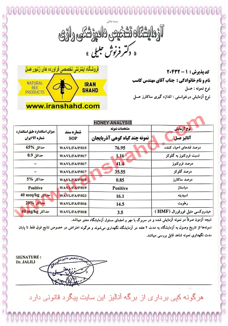 توضیحات: این عسل در ارتفاعات کوهستانی آذربایجان در محیطی کاملا بکر و دور از آلاینده های شهری بصورت کاملا طبیعی از شهد گیاهان دارویی و بدون هیچ گونه تغذیه مصنوعی تولید شده است.ارتفاعات آذربایجان دارای پوششی متنوع از گیاهان دارویی و شهد زاست که عسل این مناطق طرفداران زیادی در کشورهای همسایه مانند ترکیه، آذربایجان و عراق دارد .این عسل از طعم ملایم و بسیار دلنشین برخوردار است.بالا بودن سطح انتی اکسیدانی و انتی باکتریایی از خصوصیات بارز آن بوده و و بدلیل وجود شهد گیاه خارمریم در این عسل برای مصارف دارویی و درمانی مخصوصا بیماریهای کبدی یکی از بهترین انتخاب هاست.